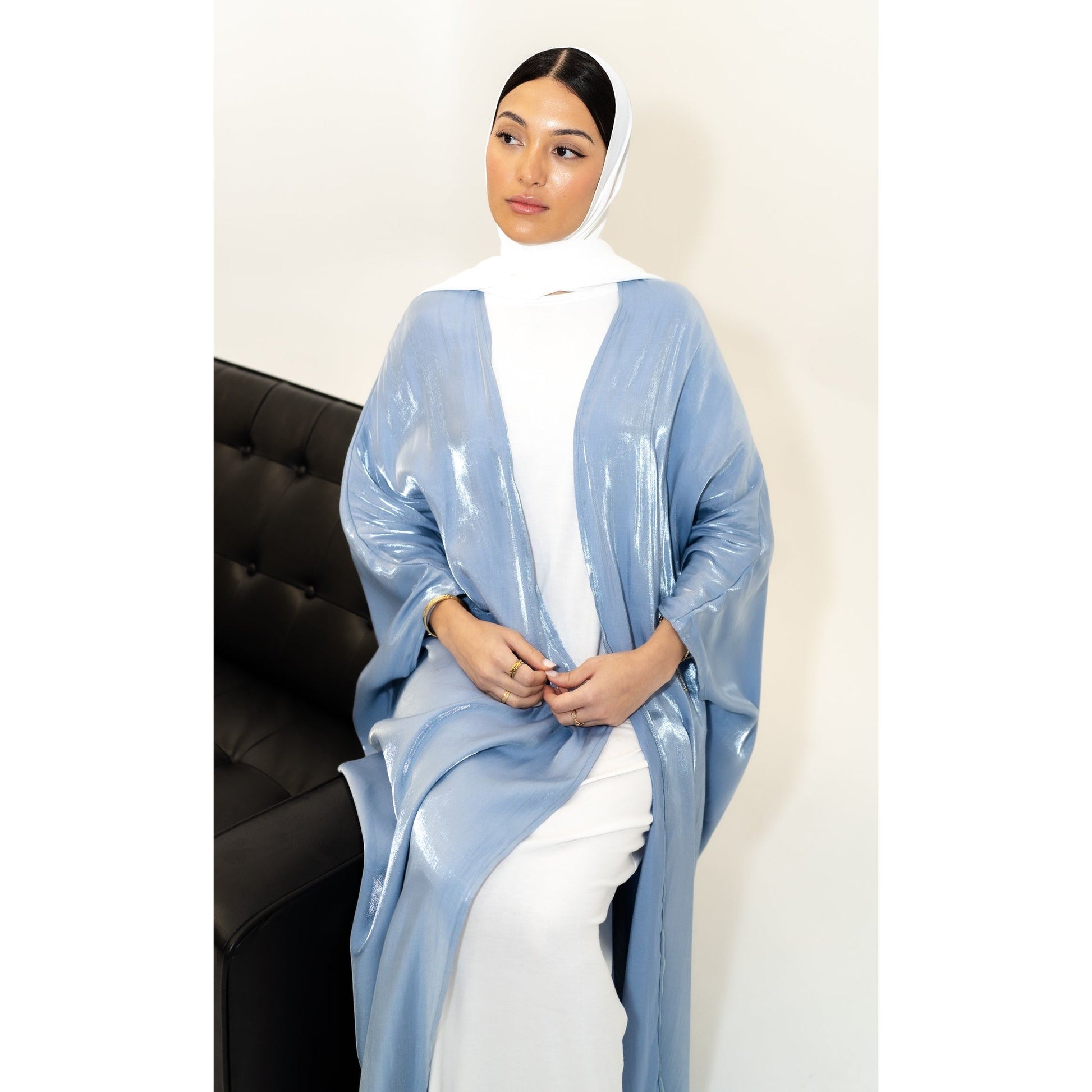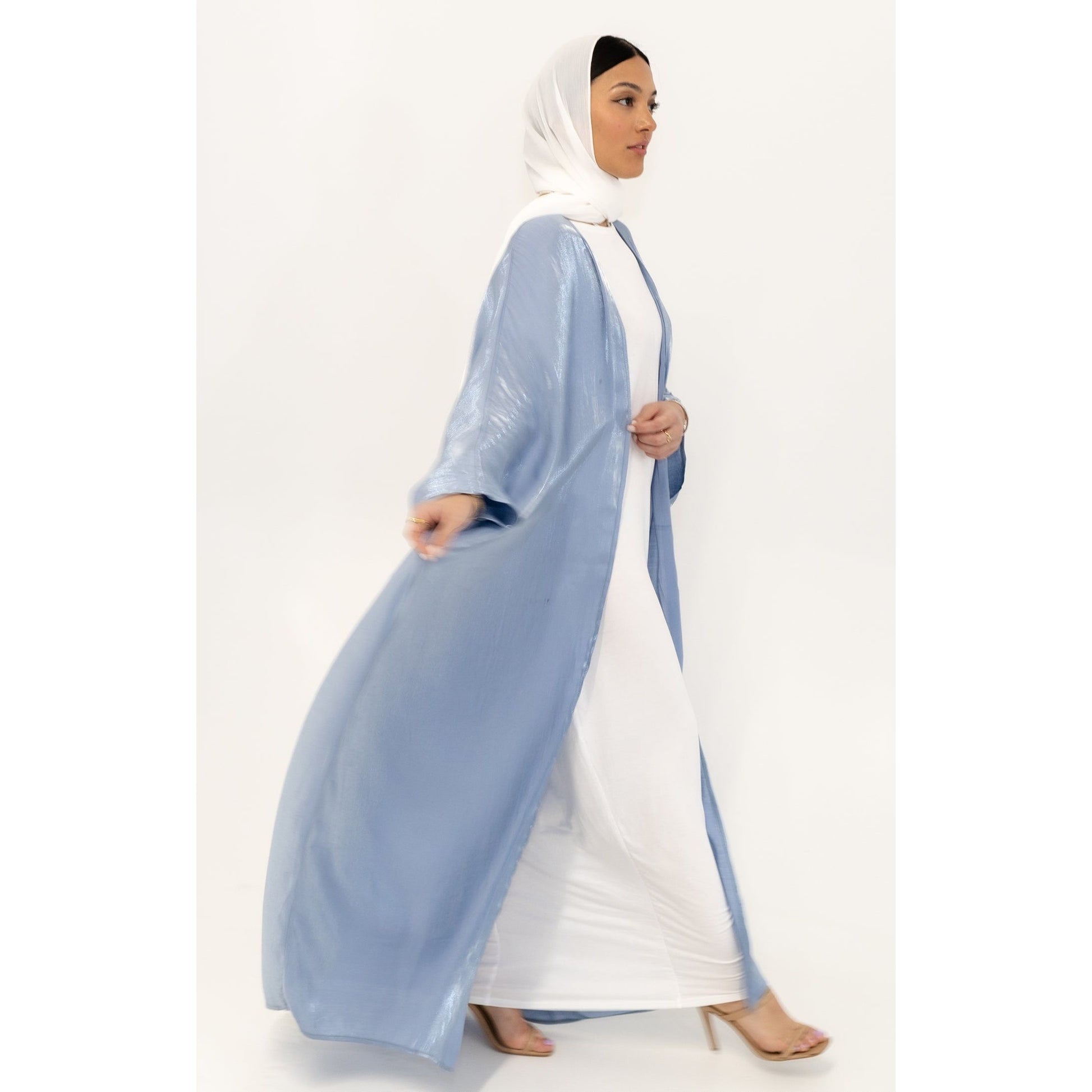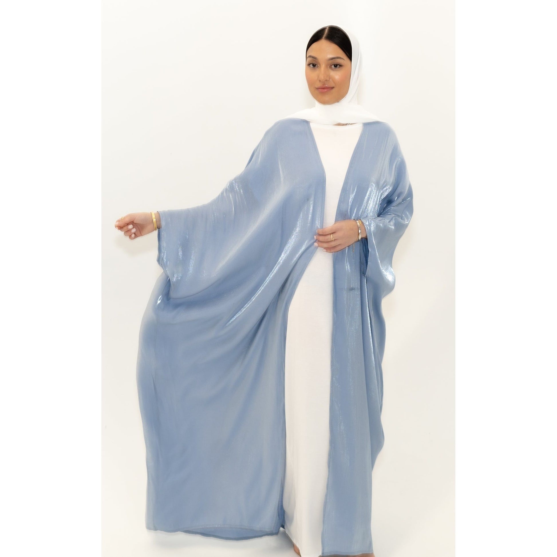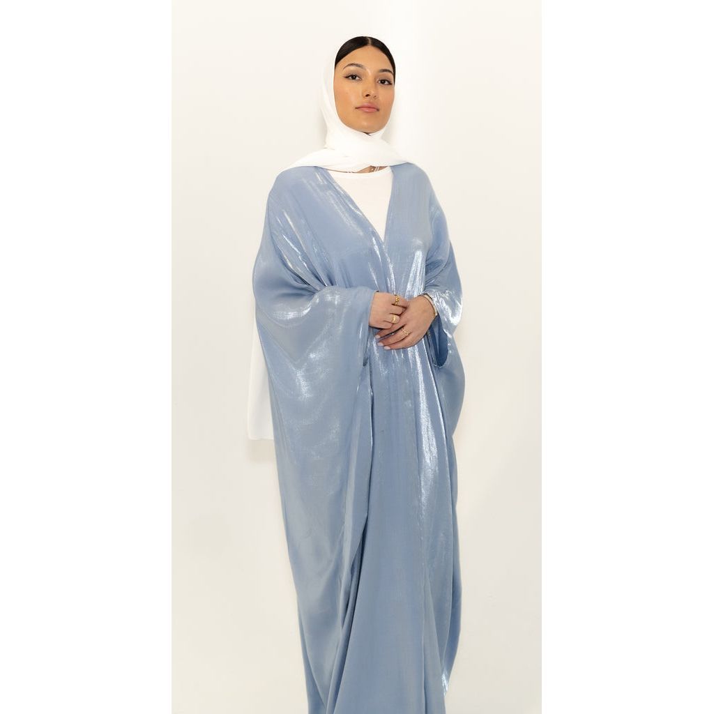 The glamorous chrome open abaya features loose batwing sleeves, and two colored tones for an elegant cover up look.One size fits all. Inner piece not included.